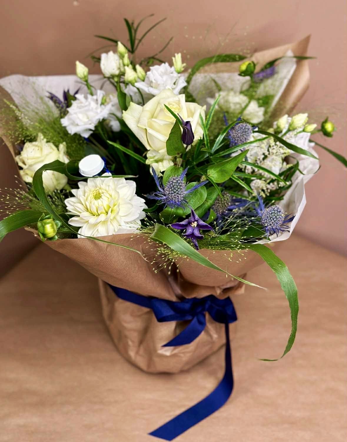 Fejr studenten og lykønsk med en vidunderlig buket. Den er bundet med det smukkeste udvalg af blå/lilla og hvide blomster, samt blå studenterhuer der gør det hele mere betydningsfuldt og festligt.