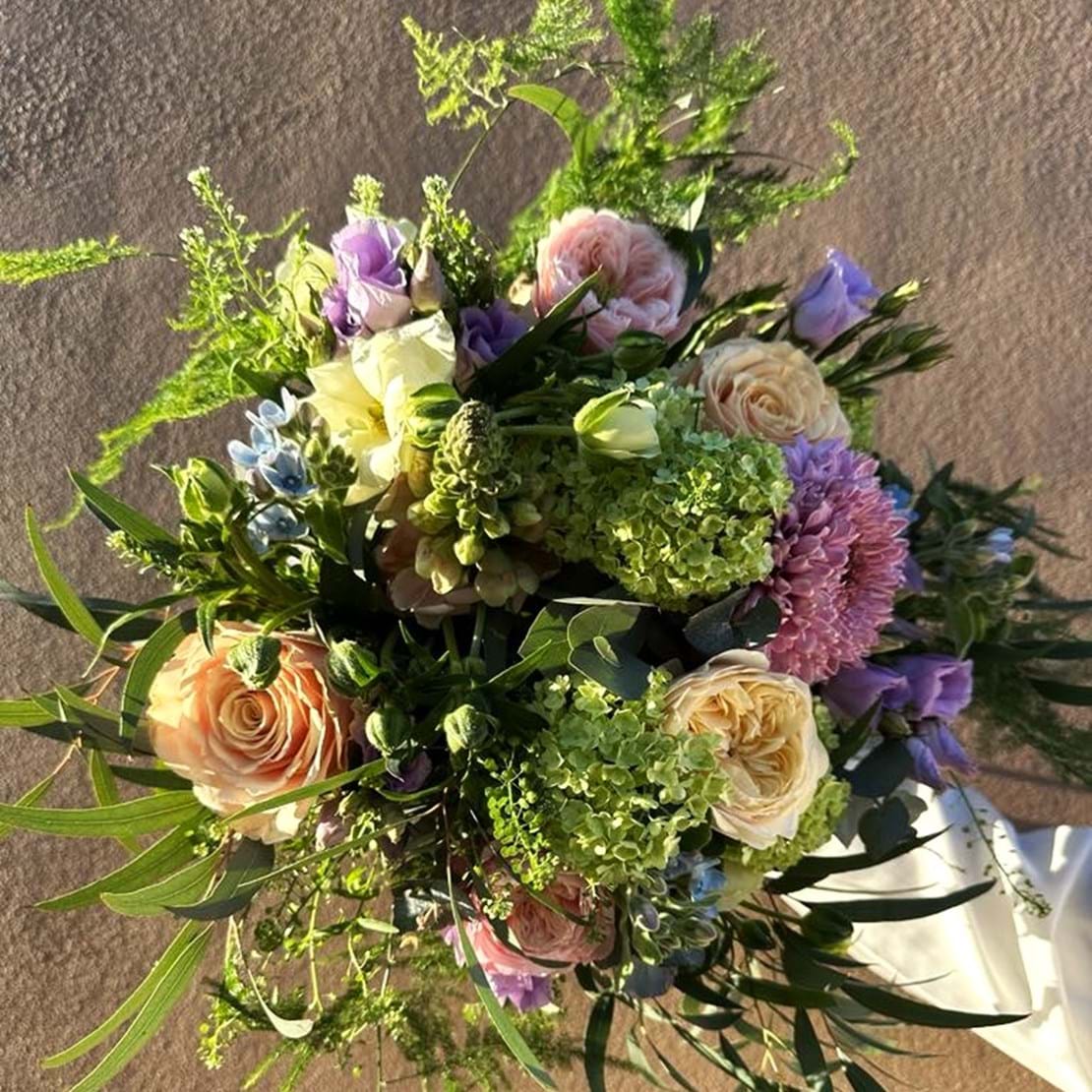 Giv vores florister helt frit valg med en smuk mellemhøj buket blomster. I denne buket vælger floristen selv blomster og farver i sæson, og buketten vil således variere efter årstid.